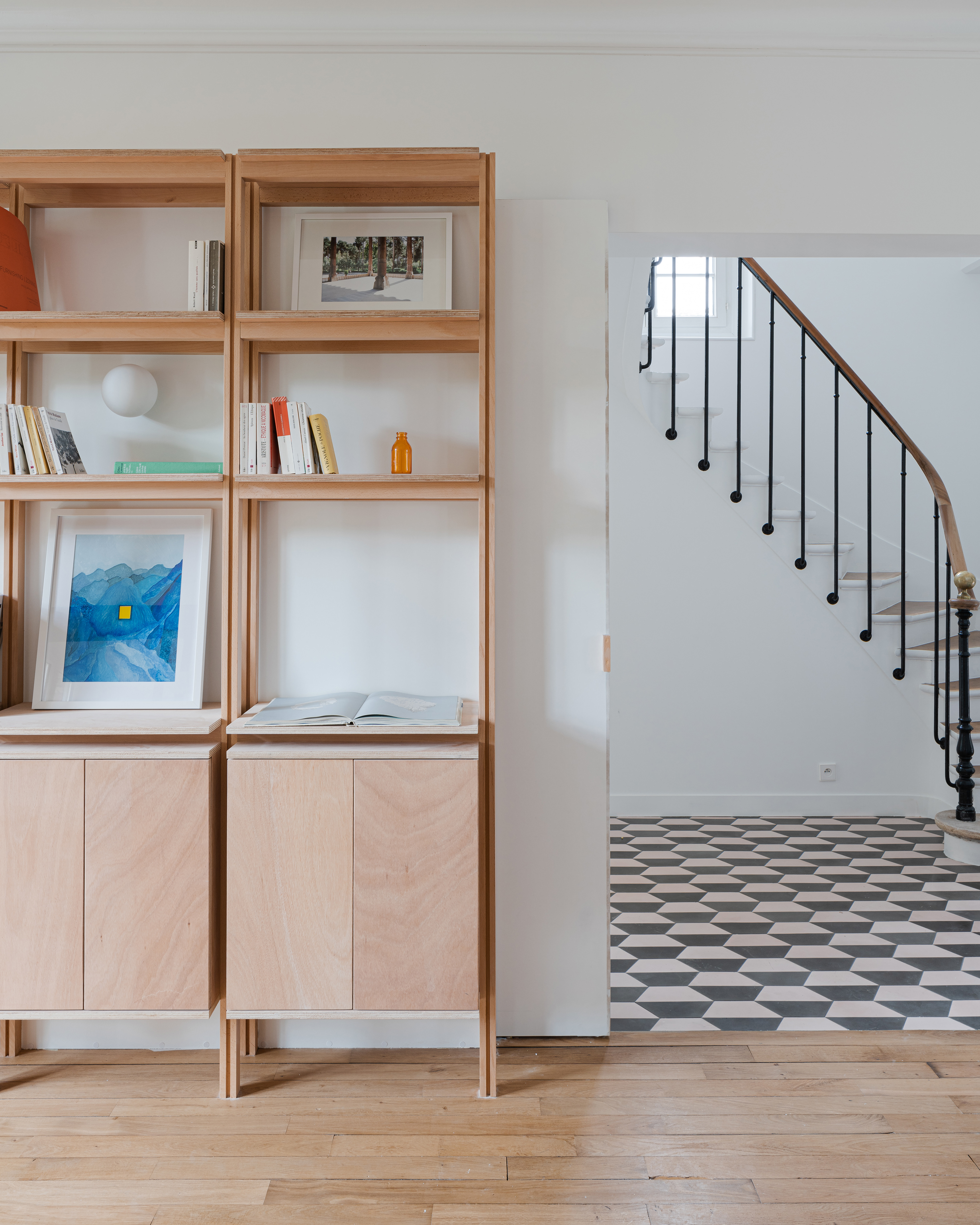 Au rez-de-chaussée, l'espace du salon, du séjour et de la cuisine ont été reconfigurés pour permettre deux moments distincts pour le repas : un coin repas attenant à la cuisine utilisé quotidiennement par la famille et une salle à manger orientée vers le jardin pour les réceptions et la vie de la famille. Une série de mobiliers sur mesure en bois (rangements intégrés dans l’entrée, bibliothèques, banquette, etc.) apporte une fonctionnalité et un confort supplémentaires à l'espace.