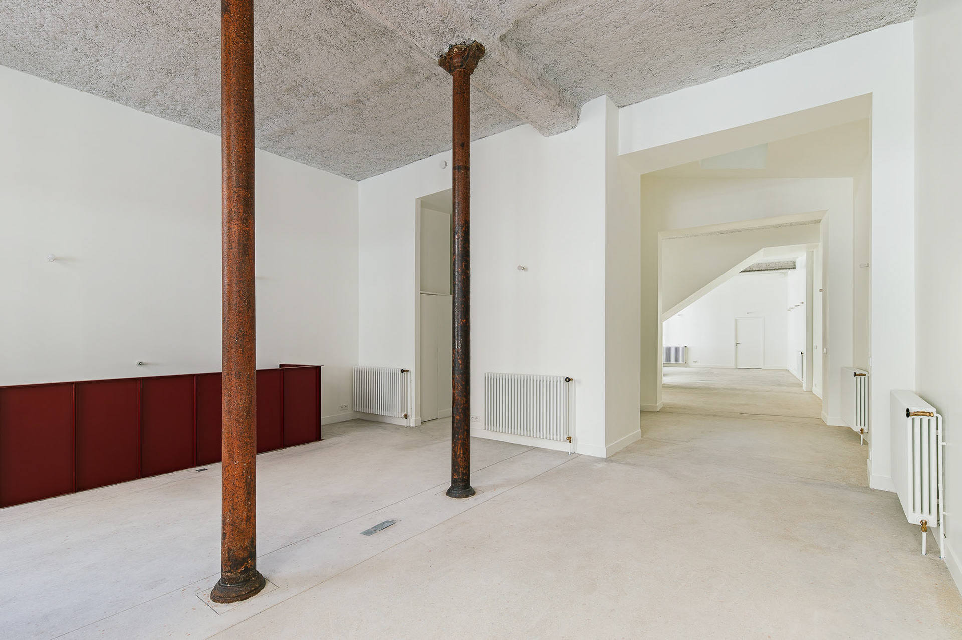 Deux grandes salles principales sur un même niveau ont été aménagés à l'intérieur du local : une salle sur rue et une salle sur cours. La salle sur rue est dominée par 2 colonnes en fonte d'origine profite de la lumière provenant des grandes vitrines . La salle sur cours, créée en léger contrebas à la place des anciens garages de l'immeuble, permet d'aménager de bureaux en "open space".